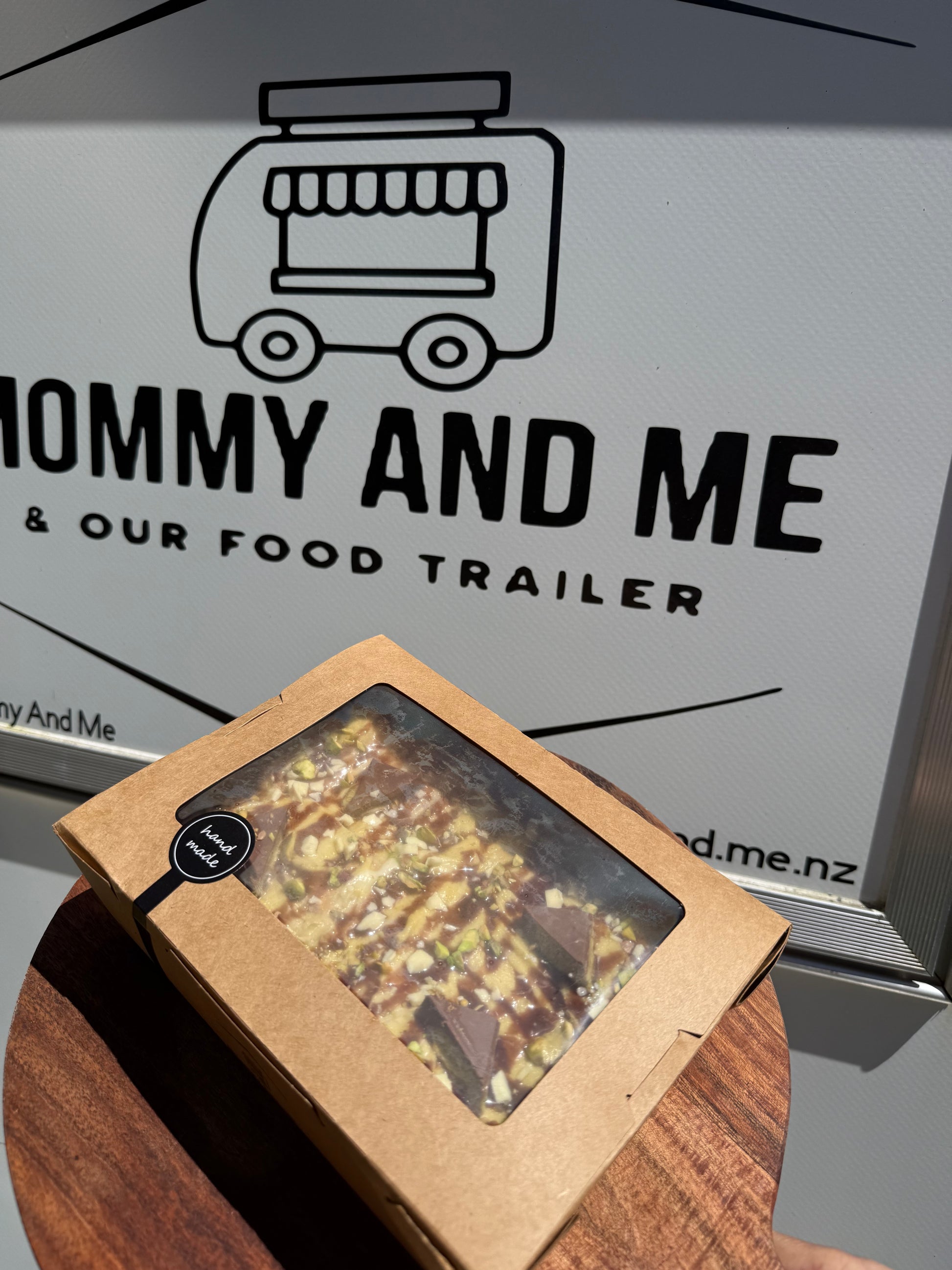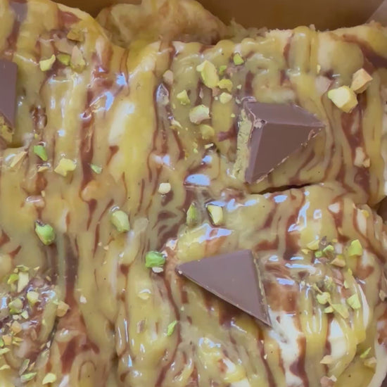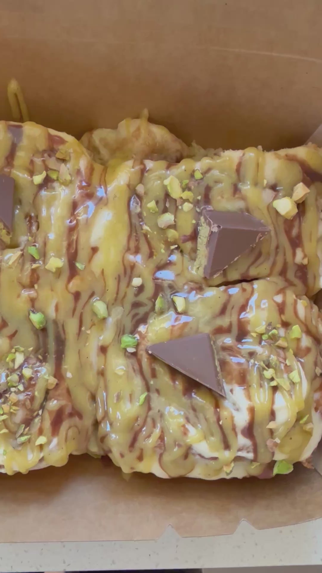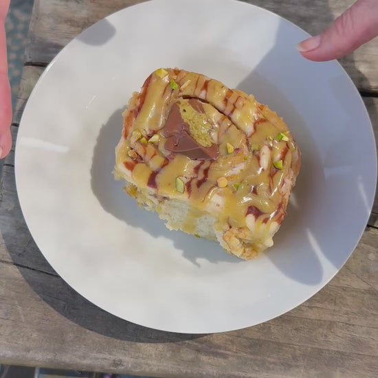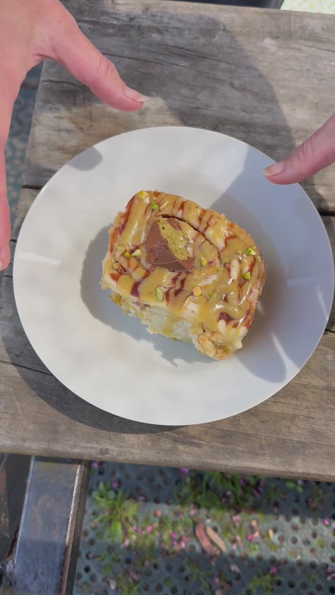 Pistachio scrolls! Layered with pistachio spread, white choc drops, chopped pistachio nuts and then topped with our pistachio frosting, a pistachio chocolate chunk and more chopped nuts! Yum! We finally got it perfect! These are soft and delicious with the perfect balance of nutty goodness!